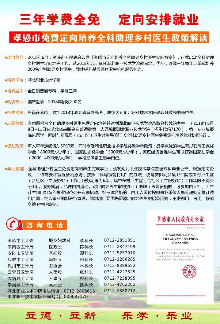 湖北职业技术学院受孝感市委托免费定向培养全科助理乡村医生招生简章