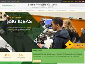 圣文森特学院成立于1846年,是一所非营利性私立文科高等教育机构,位于宾夕法尼亚州中等城市拉特罗布(人口2500-9999人)的郊区。圣文森特学院(SVC)是一所规模非常小(uniRank招生范围:1000-1999名学生)的男女同校美国高等教育机构,由中部各州高等教育委员会正式认证,正式隶属于基督教天主教。圣文森特学院(SVC)提供课程和项目,以获得官方认可的高等教育学位,如若干研究领域的学士学位、硕士学位、博士学位。有关更多详细信息,请参见下面的uniRank学位等级和学习领域矩阵。这所拥有173年历史的美国高等教育机构根据入学考试和学生过去的学习成绩和成绩实行选择性录取政策。入学率在60-70%之间,这使得这个美国高等教育机构在某种程度上具有选择性。国际申请人有资格申请入学。SVC还为学生提供若干学术和非学术设施和服务,包括图书馆、住房、体育设施、经济援助和/或奖学金、出国留学和交流计划、在线课程和远程学习机会,以及行政服务。