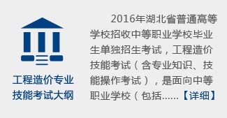 2016年湖北省普通高等学校招收中等职业学校毕业生单独招生考试,工程造价技能考试(含专业知识、技能操作考试),是面向中等职业学校(包括中等专业学校、职业高中、技工学校和成人中专)相关专业毕业生的选拔性考试,工程造价专业技能考试,应当具有一定的信度、效度和必要的区分度。