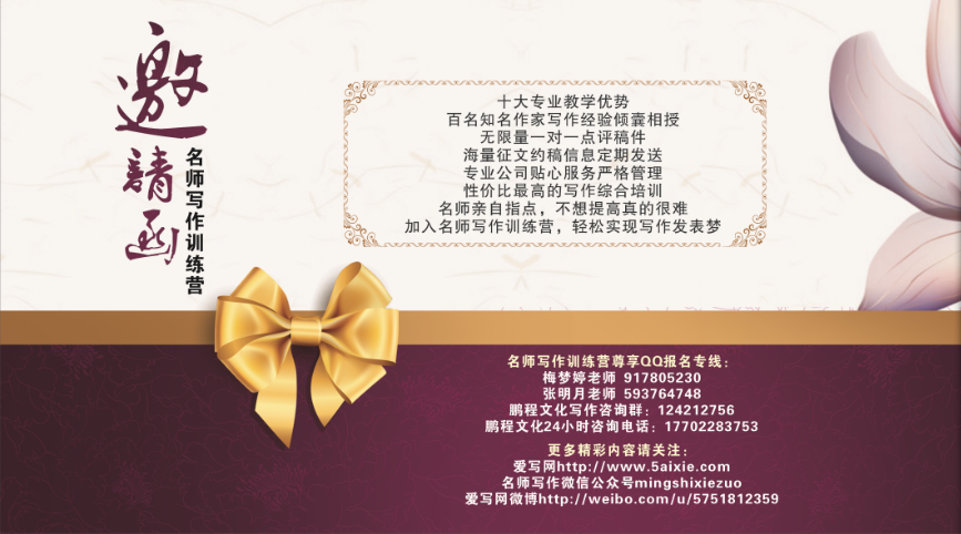 名师写作训练营是天津鹏程文化传播有限公司精心打造的涉及多文体、全方位的写作服务平台,知名作家、写手亲自授课,专业点评师细心点评稿件,优秀作品导读和写作知识分享并重,征文约稿信息定期发送,为你提供一对一、专业全面的写作指导服务,是你提高写作水平、实现文学梦想的至臻首选!