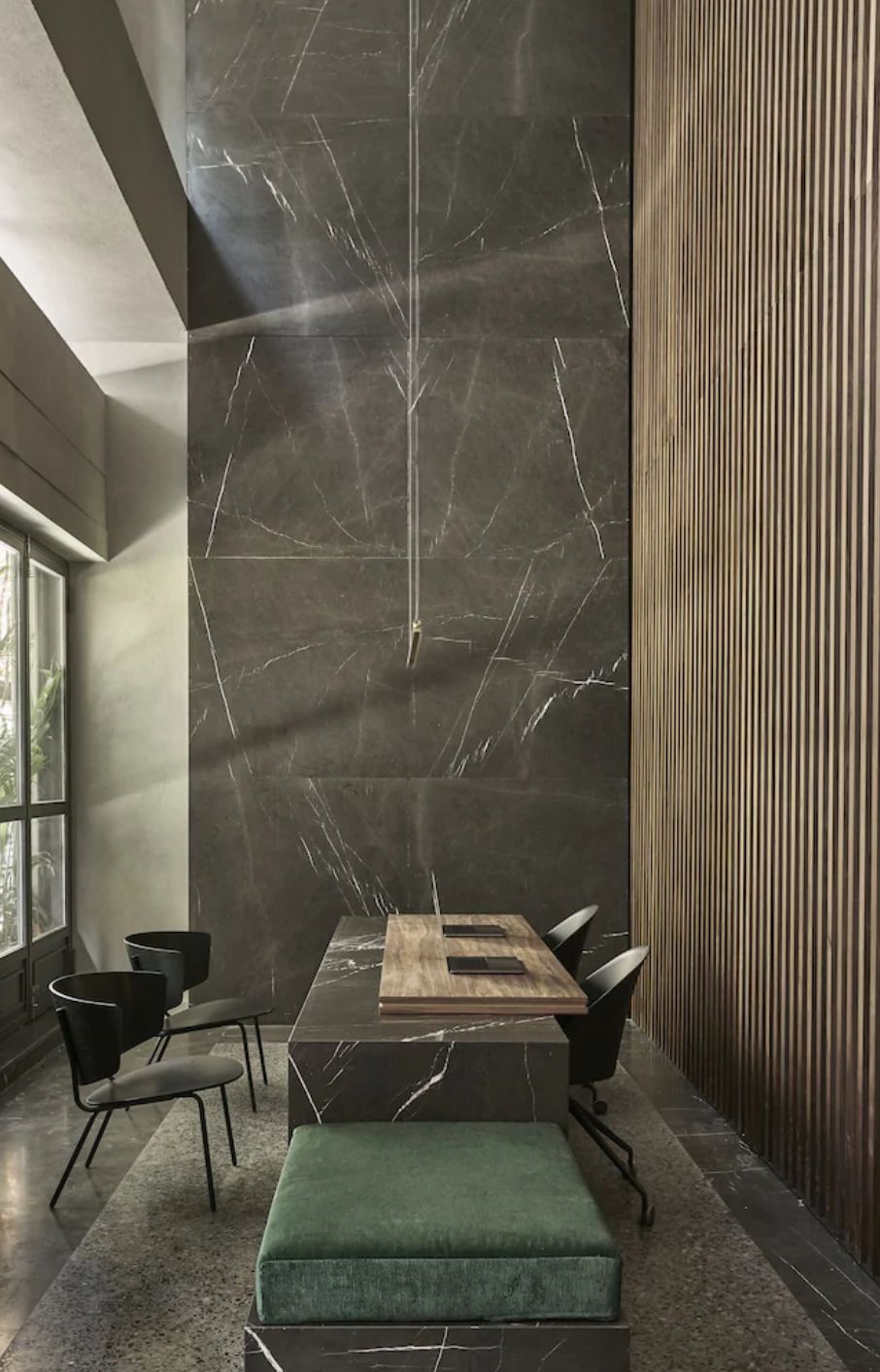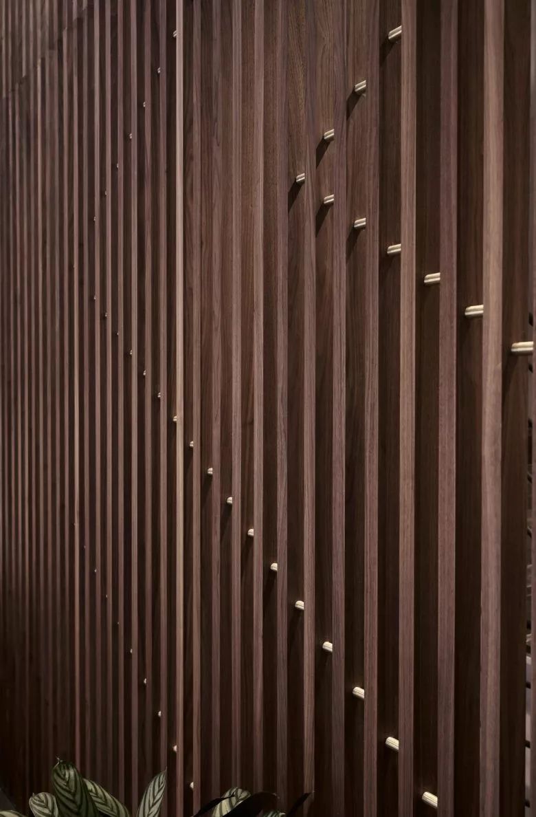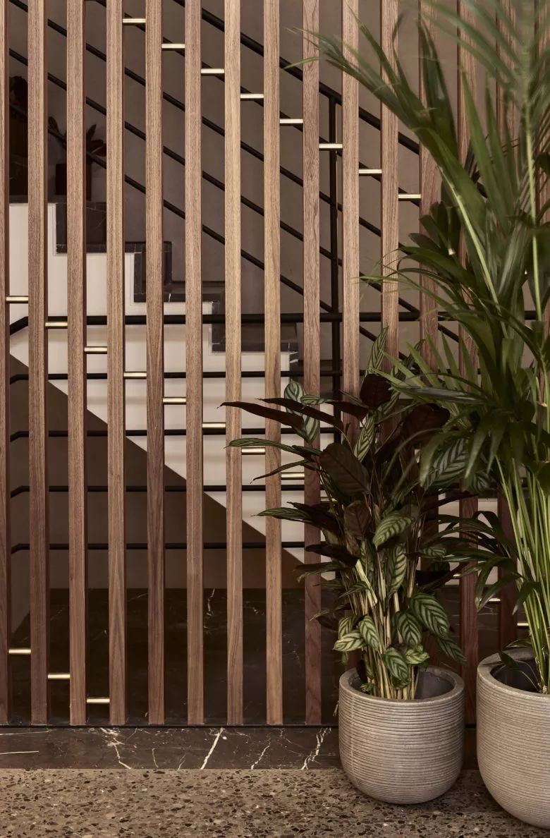 大堂,一面木质的格栅墙作为背景,增加流线感的同时,也让整体看起来更加自然大气。