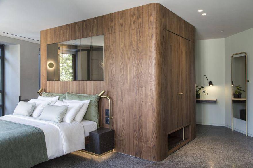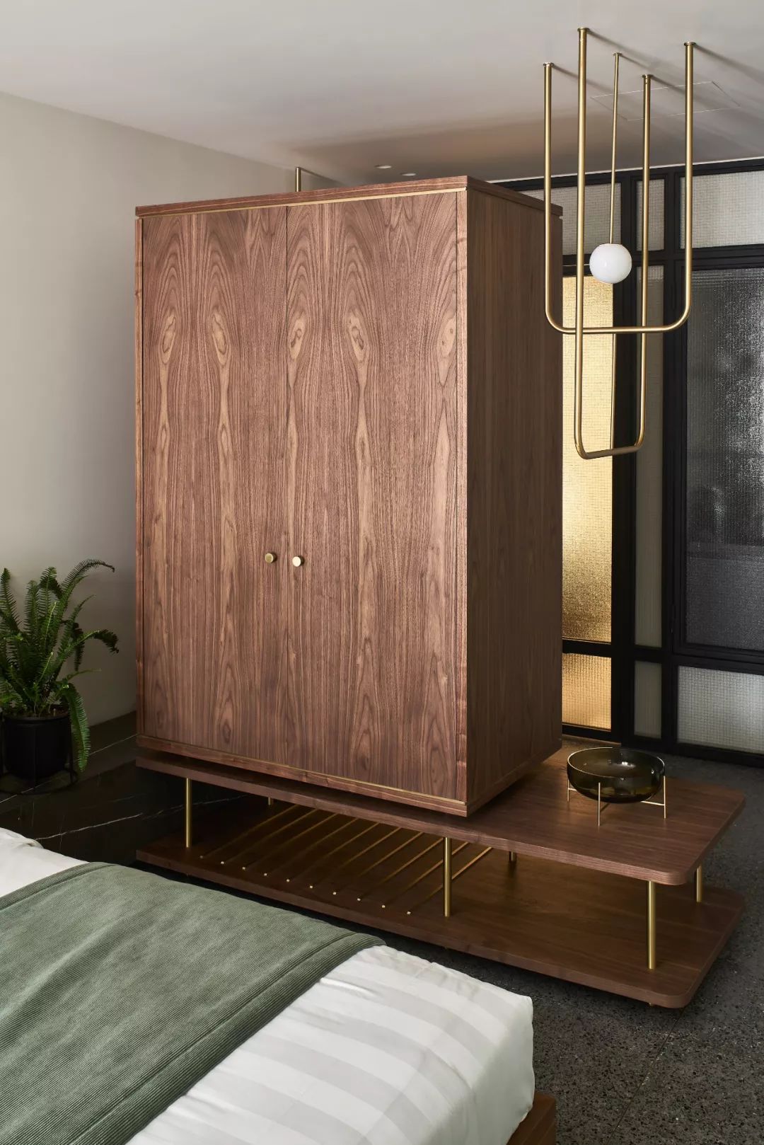 室内包括水磨石地板,腮红天鹅绒内饰,简约的沙发、金属线条的灯具和床,以及带有胡桃木装饰和黄铜色调的野兽风格定制家具,都是工作室强调的现代主义风格。