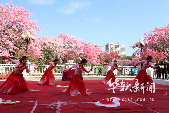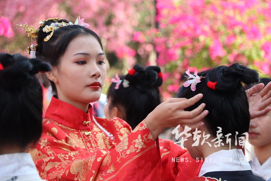 “敬花承古”华服表演中,舞者翩翩起舞,优雅的舞姿与校园里开得绚烂的丝木棉花相得益彰,在展现中华优秀传统文化魅力的同时,也让大家进一步感受到丝木棉节的文化氛围。粉色花海下,花司们身着华服入场,在红毯上接受主敬为其簪上自制的丝木棉花发簪,并献上由学院执行董事兼常务副院长迟云平所作诗文——《丝木棉赋》,以诗文的形式向观者展现华软丝木棉节的古典文化魅力和浓厚的文化底蕴。民舞队员身姿柔美,在轻歌曼舞中表现中华国粹独有的优雅。“民舞表演的意义在于致敬古典,展华软风采”,民舞队队长吴晓如说。朗诵协会则为“敬花承古”作诗词朗诵,声音抑扬顿挫、慷慨激昂,极富表现力。