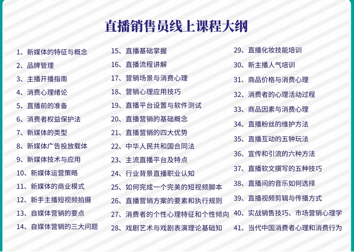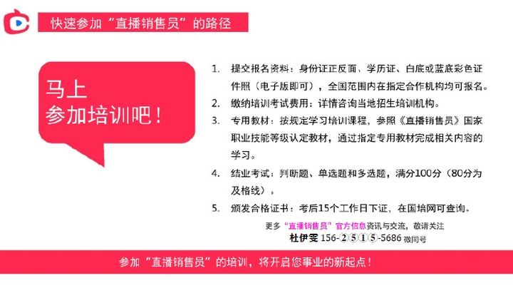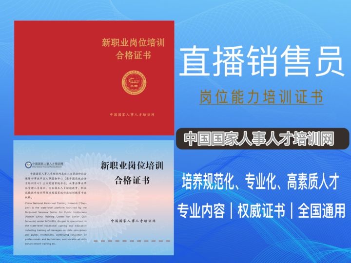 1、 国培网是中国职业技能培训线上平台权威机构之一,搭建直播销售员从业知识体系,采取线上+线下的培训模式,学员规定学时完成培训课程及考核合格的学员颁发《新职业岗位培训合格证书》。