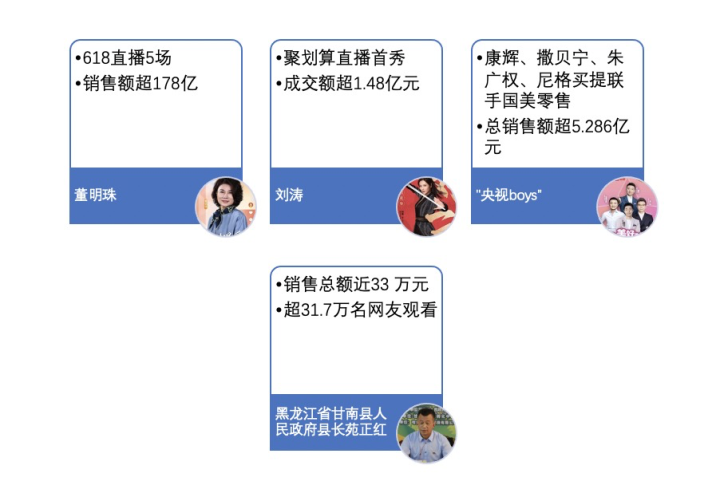 直播带货行业的火爆也吸引了各行各业的名人跨界带货,格力总裁董明珠618直播带货,明星刘涛化名“刘一刀”淘宝聚划算直播,央视多名主持人参与助力武汉复工复产的抗疫直播带货活动等等。同时,直播带货也成为扶贫新方式,各地村长、县长也都成为了新晋“带货达人”。