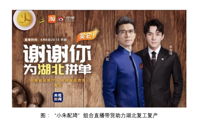 另一方面,“头部主播+名人”的模式也倍受青睐,如央视主持人朱广权与头部带货主播李佳琦组成的“小朱配琦”组合,为湖北助力在线卖货。直播最终吸引了1091万人观看,累计观看次数1.22亿,直播间点赞数1.6亿,累计卖出总价值4014万元的湖北商品。
