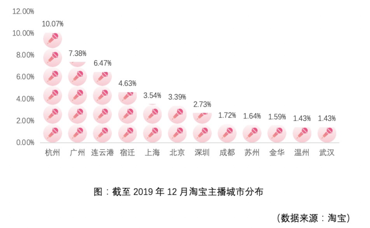 从淘宝卖货主播的城市分布来看,杭州占主导地位,成为直播电商之都,超一成的主播活跃在杭州。随着广州全力发展直播电商,凭借产业链优势位居第二。连云港、宿迁通过直播卖货实现弯道超车,直播新经济已然火遍全国。