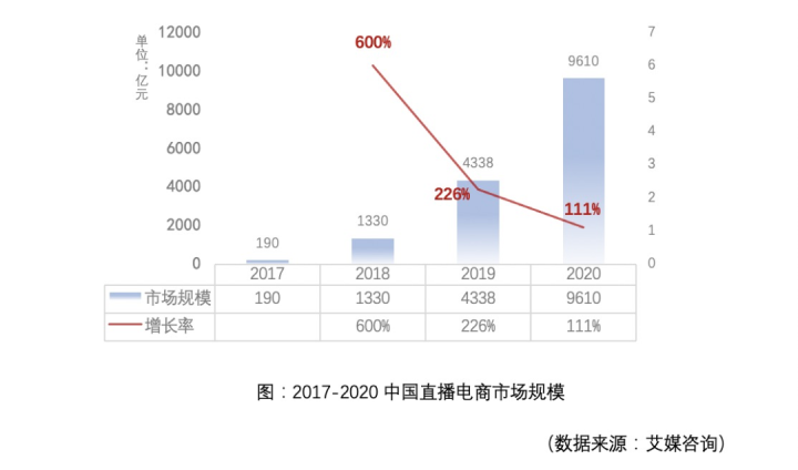 近四年来,电商行业市场规模扩张迅速,据艾媒咨询数据显示,2019年中国直播电商市场规模达到4338亿元,同比增长226%,预计到2020年将会持续以超100%的增速增长到9610亿元。