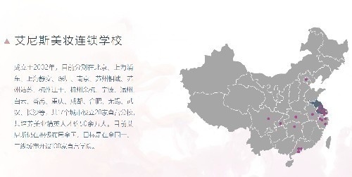 艾尼斯美妆连锁学校,是中国美妆职业技能专业培训单位,始于1985年,分校遍布北京、上海、广州、南京、苏州、杭州、宁波、温州、重庆、成都等国内一二线城市,开设美容、化妆、美发、美甲、形象设计、摄影等美业课程,年为社会输送美业人才3.2万人,学员就业率达100%。艾尼斯美妆连锁学校联合艾尼斯商学院、艾尼斯美学院、艾尼斯资本研究院、艾尼斯企业大学,经过三十余年的历史,现艾尼斯学员中有很多已成为行业名人、企业总裁、资深讲师,艾尼斯美妆连锁学校,为中国美业的发展、为中国社会的民生就业做出巨大的贡献。艾尼斯美妆连锁学校,授人以傍身之技,育人以处世之智,为每位学员而开创未来,为中国美业蓬勃发展而奋斗不息!