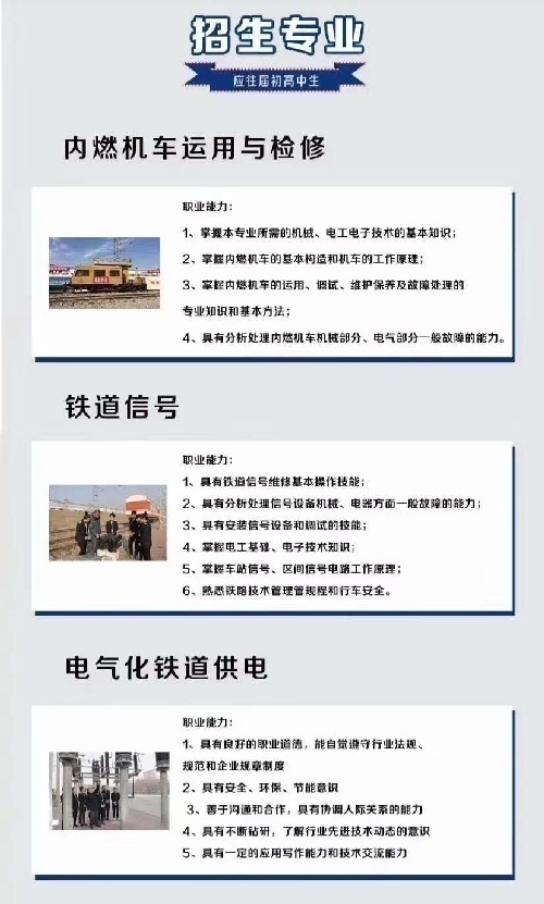 内燃机车(轨道车司机)城市轨道,高铁 乘务,车辆检修,电气化铁道供电,铁道机电技术,地铁安检!应往届初中生均可报名!初中可以连读大专!就业有保证,相信专业的力量!