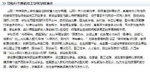 马鞍山市淮航技工学校是经过马鞍山市政府通过招生引资,安徽省人社厅备案,马鞍山市人社局批准的综合类技工学校,学校位于马鞍山市郑蒲港新区的本科院校--皖江工学院内。学校占地面积1000余亩,学校使用建筑面积5万平方米,各项设施完善。建有教学楼、实训楼、学生公寓楼、图书馆以及配套的学生活动中心、标准化运动场、学生餐厅等。现面向社会招纳各区域招生代理。淮航技工学校欢迎你的加入。