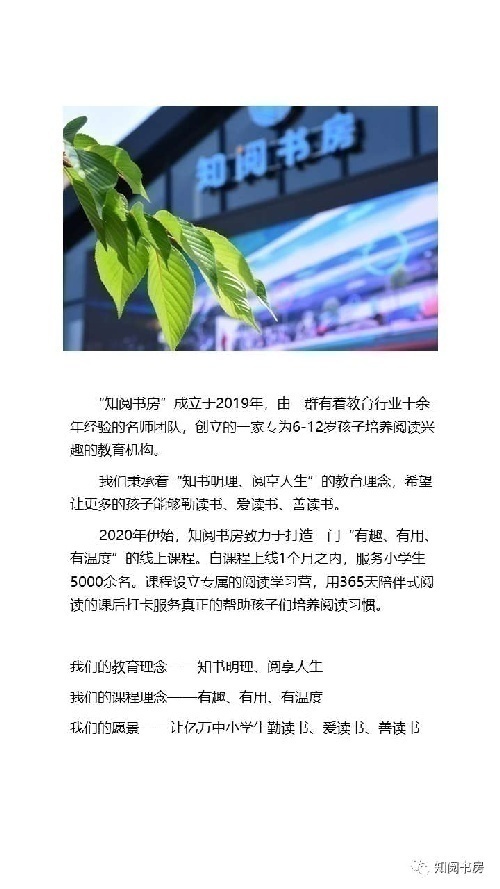 2020年伊始,知阅书房致力于打造一门“有趣、有用、有温度”的线上阅读课程。自课程上线1个月内,服务小学生5000余名。课程设立专属的阅读学习营,用365天陪伴式阅读的课后打卡服务,真正的帮助孩子们培养阅读习惯。