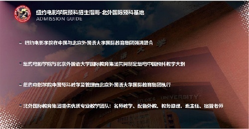 海南德创文教投资有限公司是纽约电影学院在中国唯一授权招收纽约电影学院预科的机构。纽约电影学院中国预科部分的教育是跟北京外国语大学国际教育学院合作教学的。纽约电影学院是同时获得中国教育部、美国西部学校与学院教育联盟(WASC)及美国全国艺术与设计院校协会(NASAD)认证的美国高等艺术学院中国留学基金委员会公派留学影视类指定学习院校中国党政机关工作人员影视类培训的指定机构