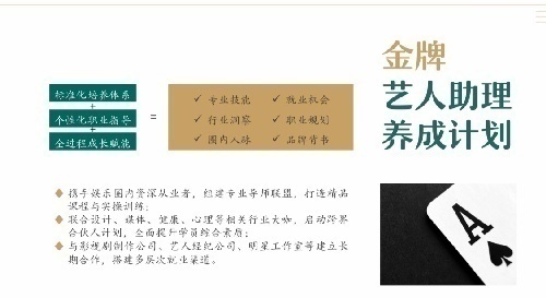 公司秉承“为人才价值赋能”的初心,通过“人才培养+形象传播+跨界联盟”三位一体的创新模式,重新定义泛娱乐圈服务业的内涵,不断延展人才价值链的外延,致力于行业健康发展培养“技能满分”从业者,传播“偶像榜样”正能量,搭建“跨界融合”的人才生态圈;给明星、艺人、导演、制片、经纪人及圈内好友输送优质人才。