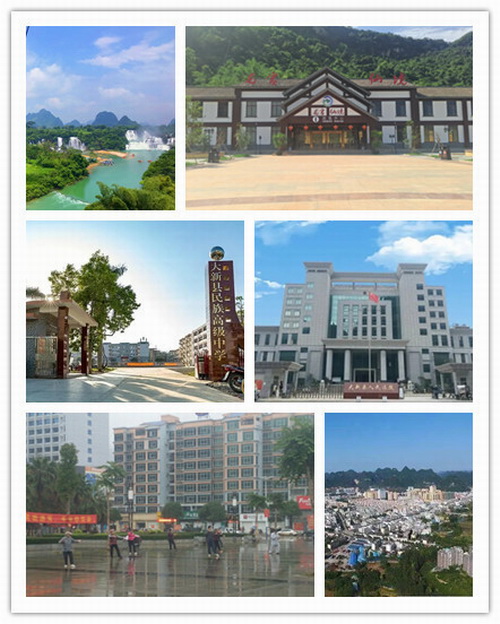 大新县是以壮族为主体的少数民族聚居县份,居住着壮、汉、瑶、苗等23个民族。大新古属骆越地,始治于秦,宋袭土司制度,八大土司管治延续千年,有短衣壮文化、高腔诗蕾山歌文化、南疆土司文化、山崖壁画等文化遗产。境内地形大体上略成菱形,地势东北、西北高,逐渐向南倾斜,中部稍低凹成槽形的石山盆地。崇靖高速公路、国道G358线、国道G359线、国道G219线、国道G243线和S311省道、驮卢至大新二级公路过境。