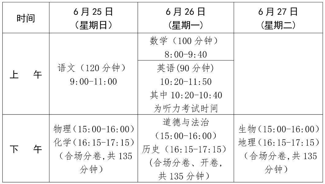 2.物理和化学、道德与法治和历史、生物和地理为合场分卷考试,中间间隔时间考生不离场,其中道德与法治和历史为开卷考试。
