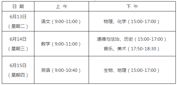 3.文化课和艺术(音乐和美术)。全市统一于6月13日至15日进行,具体安排如下: