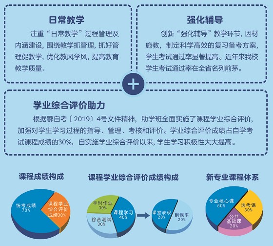 湖北省是国家高等教育自学考试综合改革试点省份,学校率先参与自学考试综合改革试点,优化管理、深化创新、多措并举,成效显著。