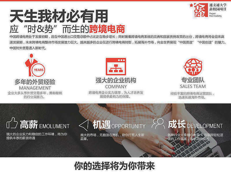 信息工程学院于2016年7月与阿里巴巴速卖通大学签订鑫校园合作项目,现已将速卖通跨境电商教学平台纳入电子商务专业实训教学计划,通过实训学习的同学可考取阿里巴巴速卖通大学跨境电商运营专员证书并进入速卖通人才库,人才库会自动推荐同学们在全球速卖通联盟企业就业,毕业生也可以选择在全球速卖通平台自主创业。
