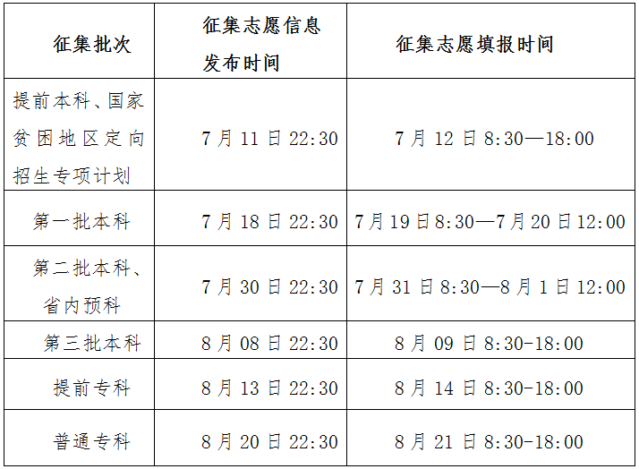 实行梯度志愿的批次,各设置2个院校志愿、4个专业志愿、1个专业调剂服从选项和1个院校服从调剂选项。实行平行志愿的批次,设置3个平行院校志愿,每个院校设置4个专业志愿、1个专业调剂服从选项及1个院校服从调剂选项。各批次定向计划征集志愿设1个院校志愿、4个专业志愿、1个专业调剂服从选项及1个院校服从调剂选项。根据各批次招生录取进程,实行分段方式填报。具体征集范围及征集时间预安排如下: