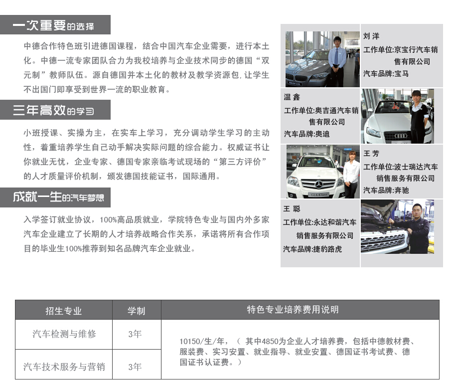 具有良好的职业道德和创新精神,能胜任汽车制造、装配、运行管理和售后服务等工作适应生产、建设、管理、服务第一线需要的“能胜岗+能转岗”的高素质、可持续发展的技术技能型人才。