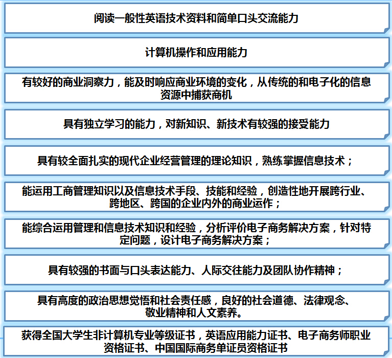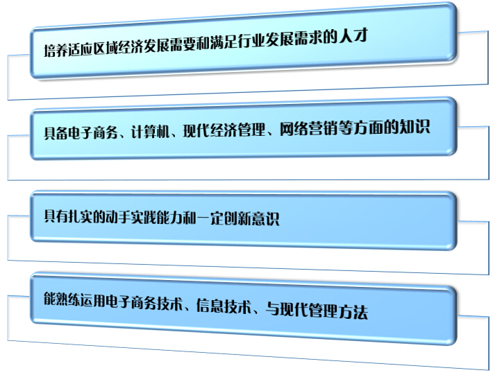 本专业是融计算机信息科学、管理学、市场营销学、商务贸易和现代物流于一体的新型交叉学科。采用四平台八模块(简称4F8M课程体系)课程结构,改革了专业实践课程结构体系,将专业实践教学项目分为课程实习、职业岗位认知实践、企业岗位综合实训、毕业设计或毕业论文、专业技能考核等模块,强化学生实践动手能力训练,落实工学结合,校企合作,讲训并重,学练结合的培养模式,形成“岗课证”对接的课程体系。