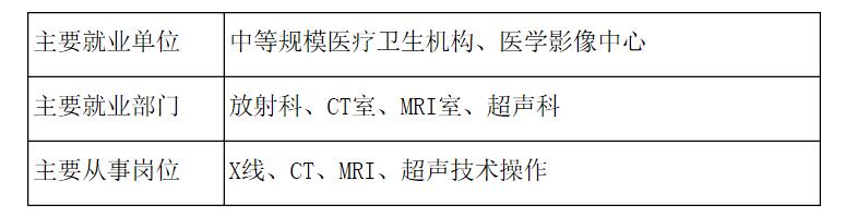 本专业主要面向中等规模医疗卫生机构或医学影像中心,培养具有扎实医学影像技术专业知识及较强动手能力,在放射科、CT室、MRI室、超声科从事现代医学影像检查技术、医学影像设备保养与维护工作的技术技能人才。