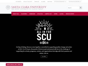 圣克拉拉大学(Santa Clara University)成立于1851年,是一所非营利性私立高等教育机构,位于加利福尼亚州小城市圣克拉拉(Santa Clara,人口50,000- 249999人)的市区。由WASC高级学院和大学委员会正式认证的圣克拉拉大学(SCU)是一所中等规模的美国高等教育机构(uniRank注册范围:9000 - 9999名学生),正式隶属于基督教和天主教。圣克拉拉大学(SCU)提供官方认可的高等教育学位的课程和项目,如几个研究领域的学士学位、硕士学位、博士学位。详情请参阅下面的uniRank学位水平和学习领域矩阵。这所拥有169年历史的美国高等教育机构有一个基于入学考试和学生过去的学术记录和成绩的选择性录取政策。录取率在50-60%之间,这使得这所美国高等教育机构成为一所普通的选择机构。国际申请者有资格申请入学。SCU还为学生提供一些学术和非学术设施和服务,包括图书馆、住房、体育设施、财政援助和/或奖学金、海外学习和交换项目、在线课程和远程学习机会,以及行政服务。