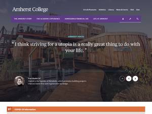 阿姆赫斯特学院成立于1821年,是一所非营利性私立文科高等教育机构,位于马萨诸塞州阿姆赫斯特(人口范围为10000-49999人)小镇的郊区。阿默斯特学院(AC)是一所规模非常小(uniRank招生范围:1000-1999名学生)的男女同校美国高等教育机构,由新英格兰高等教育委员会正式认证。阿默斯特学院(AC)提供课程和项目,以获得官方认可的高等教育学位,如若干研究领域的学士学位。有关更多详细信息,请参见下面的uniRank学位等级和学习领域矩阵。这所拥有199年历史的美国高等教育机构根据入学考试和学生过去的学习成绩和成绩实行选择性录取政策。入学率在10-20%之间,使这家美国高等教育机构成为最具选择性的机构。欢迎国际学生申请入学。AC还为学生提供一些学术和非学术设施和服务,包括图书馆、住房、体育设施、经济援助和/或奖学金、出国留学和交流计划以及行政服务。