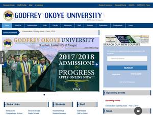 Godfrey Okoye大学成立于2009年,是一所非营利性私立高等教育机构,位于埃努古大城市Ugwuomu-Nike(人口范围为500000-1000000)的城市环境中。该学院还在埃努古设有分校。戈弗雷·奥科耶大学(Godfrey Okoye University,GO Uni)是尼日利亚国家大学委员会正式认可的一所小型男女同校的尼日利亚高等教育机构,正式隶属于基督教天主教。Godfrey-Okoye大学(GO-Uni)提供课程和项目,以获得官方认可的高等教育学位,如若干研究领域的学士学位、硕士学位。有关更多详细信息,请参见下面的uniRank学位等级和学习领域矩阵。这所拥有10年历史的尼日利亚高等教育机构根据学生过去的学习成绩和成绩实行选择性录取政策。欢迎国际学生申请入学。GO Uni还为学生提供若干学术和非学术设施和服务,包括图书馆、住房、体育设施、经济援助和/或奖学金、出国留学和交流计划、在线课程和远程学习机会,以及行政服务。