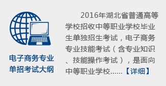 2016年湖北省普通高等学校招收中等职业学校毕业生单独招生考试,电子商务专业技能考试(含专业知识、技能操作考试),是面向中等职业学校(包括中等专业学校、职业高中、技工学校和成人中专)相关专业毕业生的选拔性考试,电子商务专业技能考试,应当具有一定的信度、效度和必要的区分度。