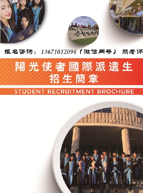 “阳光使者”国际派遣生,实行免雅思、免经济担保,只需面试录取,工薪学费,因此,“阳光使者”国际派遣生项目门槛低,费用经济。成为“阳光使者”国际派遣生,只要按照规定的培养计划,按时完成规定的课程、课时、学分,并且合格者,均能按时获得由美国马歇尔大学或韩国湖南大学颁发的学历、学位毕业文凭。证书全球认可,中国教育部留学服务中心认证,中国高等教育学生信息网可查询;享有国内普通学历、学位同等待遇。并且学员个人信息编入世界华人联合总会高级人才信息库,全球共享,终身受益。在国外大学学习期间,可带薪实习,实习报酬基本能解决学业期间相应的经济支出。毕业后,根据学生自愿可由世界华人联合总会安排到国外就业。