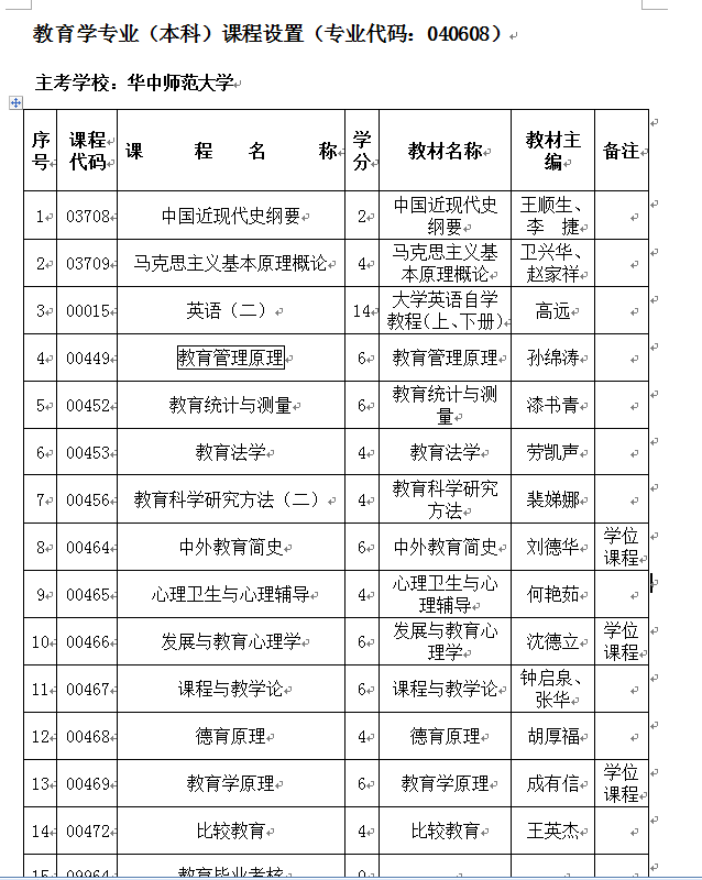 教育学专业考试科目为:教育管理原理、教育统计与测量、教育法学、教育科学研究方法(二)、中外教育简史、心理卫生与心理辅导、发展与教育心理学、课程与教学论、德育原理、教育学原理、比较教育;每年4月的周末、10月的第三个周末举行考试,单次最多报考4科,正常3-4次科目考试考完,最终申报本科毕业论文,之后提交材料办理本科毕业,毕业证原件到办公室领取或到邮寄。