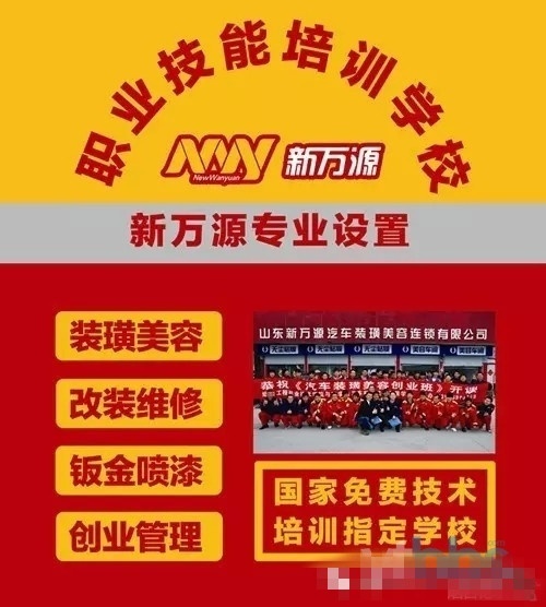 烟台市新万源职业技能培训学校是经山东省烟台市人力资源和社会保障局批准,由山东省最具影响力、专业性和技术性的港城地区第一品牌山东新万源汽车装璜美容连锁有限公司创办。主要开设学期1至6个月的汽车装璜、美容、快修养护专业的全日制培训学校。至今具有20年技术培训经验,学校实施产学研相结合、订单式的人才培养模式,与国内百余家企业建立了紧密的毕业生供需联系,并保证了学生不出校门就可以接受先进企业的技术模式和团队文化熏陶;学校还拥有五座标准化汽车装璜美容实训基地,另有20多个校外实习基地,构成了实践教学的强大后盾,培养出的学员理论知识扎实、操作技能过硬、适应能力强、综合素质好,长期受到用人单位的青睐,毕业生就业率一直保持在100%,连续几年都出现了供不应求现象。结合行业发展特性:投资少、发展快、利润高。学校推出的创业扶持政策已帮助超过50%的毕业学员成功创业。学校与学员入学即签订《培训协议》。