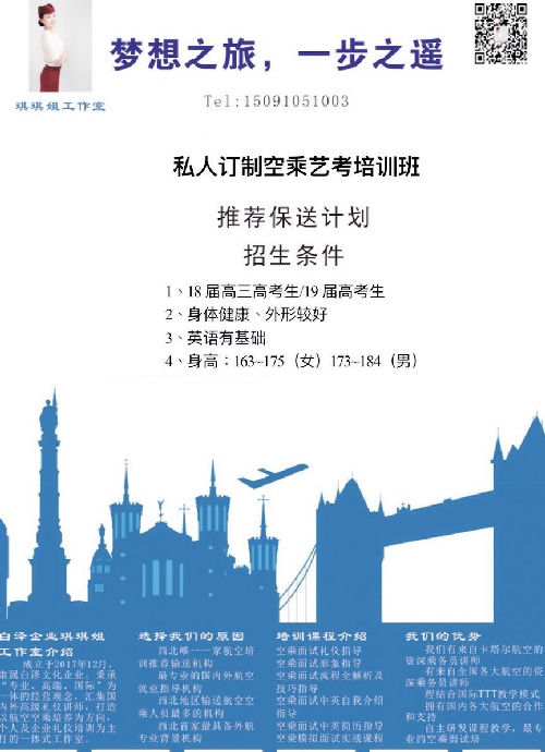 针对空乘艺考生我们推出私人一对一教程,课程共计20课时,可根据学生时间自由安排上课时间,我们拥有卡塔尔航空资深乘务长、国际注册礼仪讲师杨老师亲自授课,对空乘艺考的学生从航空空乘职业规划、面试技巧指导、形象指导、礼仪指导和模拟面试五大模块进行针对考生个人的定制课程。
