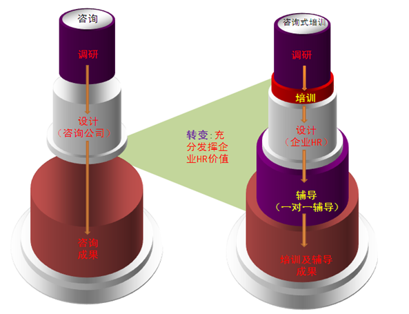 传统的咨询服务,由第三方咨询公司基于调研结果进行咨询内容设计,以咨询成果为最终的项目输出成果。咨询式培训改变传统的咨询方法,充分挖掘并提升HR在人力资源管理的专业素质与能力,由专家老师提供科学实用的设计方法,企业HR自行设计,在设计的过程中专家老师远程全程辅导,并在设计内容出来后开展一对一辅导,最终形成咨询式培训成果。