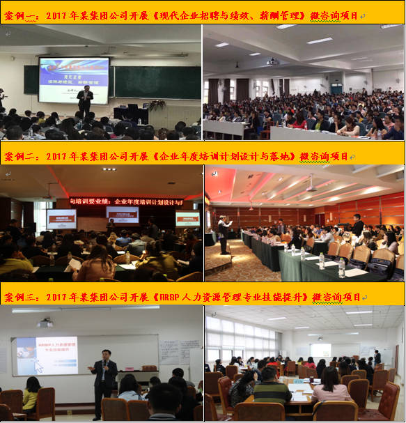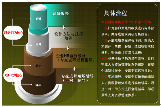 二是开展短期课程课程培训,围绕人才测评、岗位、薪酬、绩效等需求的分析,传授具体的设计内容、方法、流程与工具;