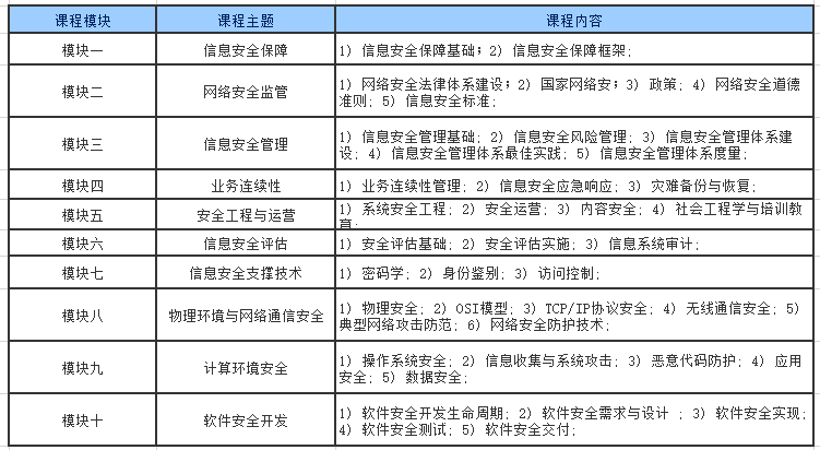 1、培训为脱产形式,30小时专业培训(5天),全面、系统地掌握最新CNISEC CISP知识大纲。掌握包括信息安全保障、监管、信息安全工程、运营、信息安全管理、业务连续性、信息安全评估、软件安全开发、安全支撑、计算机及网络通信安全等,共十个知识域。