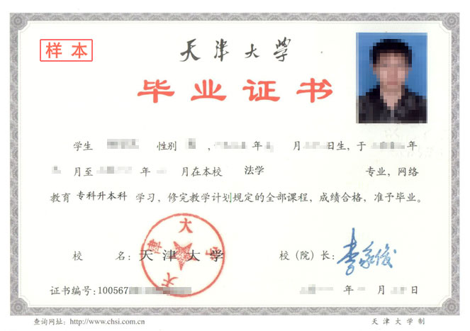 学生在学习期限内修满所修专业教学计划规定的全部学分、考试成绩合格,专科升本科学生须通过教育部规定的现代远程教育试点高校网络教育部分公共基础课全国统一考试,可获得国家承认的由教育部统一电子注册的天津大学毕业证书,注明网络教育,加盖“天津市成人高等教育证书专用章”,电子注册中办学类型代码为“7”。符合教育部、天津市及天津大学有关成人学位授予条件者,授予成人高等教育学士学位。