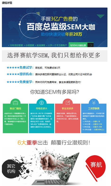 赛航教育业务类型主要包括面授培训、网络远程教学培训、网络直播课程培训、IT类图书出版等。赛航教育为广大学员提供更加人性化的选课服务,包括闭班集训营、周末精讲班、在线网课等系列产品。更联合高校开设学历班,学成后将获得国家承认的大专、本科学历,满足广大学员对更多技能、更高学历的追求。