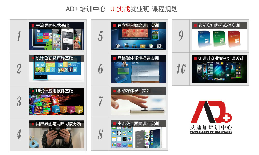 课程规划以大量的真实商业案例为主,必要的视觉基础理论为辅,在专业高品质界面设计案例重构的同时讲授设计软件的操作使用技术,教学以用,使学员能够做到学习有目的,设计有方向。课程配备基础软件操作教师和资深设计实战训练讲师,使学员再打下坚实的软件操作基础的同时,具备实战设计能力,使个人能力更好的与设计师岗位要求并轨。课程周期结束前免费配送岗前培训课程,可以帮助学员在进一步的工作岗位上更快的融入工作环境,为以后的职业道路做好前期规划。