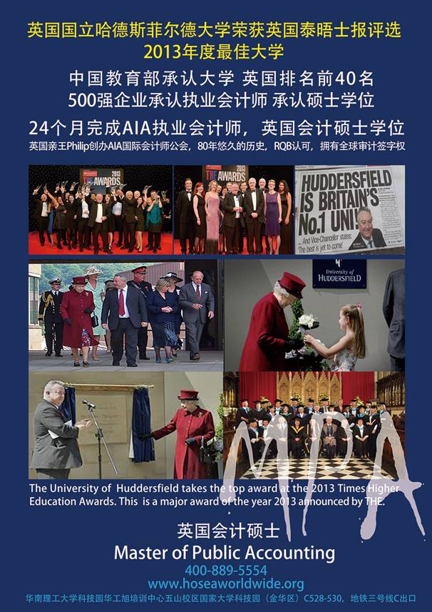 英国哈德斯菲尔德大学(HUD)是中英相互承认高等教育学位协议的英国正规大学,是英国重点发展教育的国立大学,建校于1841年,2013年英国卫报排名48,泰晤士报排名57,Times排名57;依照英国哈德斯菲尔德大学(HUD)与国际会计师公会(AIA)签订课程互认协议,完成HUD-MPA课程并符合条件的学员,可免试直接申请AIA具有“一证双师”的国际会计师资格证书(AAIA),得到全球85个国家和地区的广泛认可。学员在获得英国MPA硕士学位的同时,享有会计师和审计师的双重执业资格。