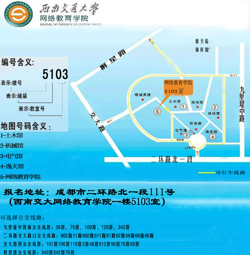 地址:成都市二环路北一段111号西南交通大学网络教育学院(国际会议厅)1楼