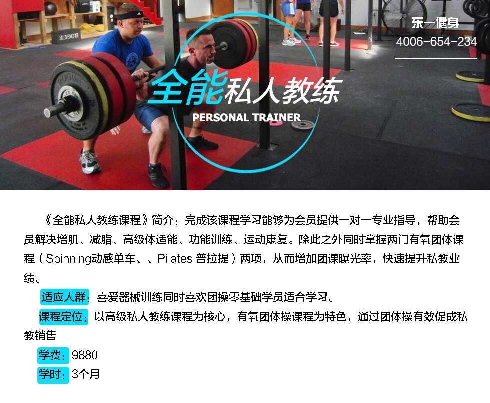 《全能私人教练课程》是指完成该课程学习能够为会员提供一对一专业指导,帮助会员解决增肌、减脂、高级体适能、功能训练、运动康复。除此之外同时掌握两门有氧团体课程(Spinning动感单车、、Pilates 普拉提)两项,从而增加团课曝光率,快速提升私教业绩。