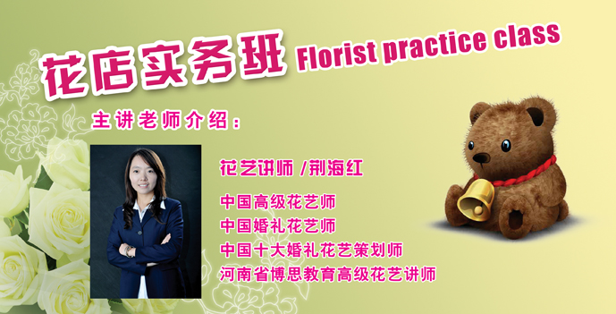 《针对准备开花店,准备从事花艺工作的人群开设的,主要内容,:国内外花艺的发展趋势.国内外用花习俗,花店定位.花店选址.网上花店,花店装饰与布置,花店空间利用,店内布置与色彩,橱窗展示.花店经营,开新花店的前期准备工作,投资预算.花店营销管理.专业素质培训.发展客户群.花店营销策略.淡季的花店经营,超市花店营销.花店财务管理.鲜花的保鲜方法.了解四季鲜花的习性.插花的基本方法,空间;基础配色;基础(半球、三角、扇型、椭圆)造型插做;单面观、四面观花束手法。花语.通用礼仪的插花技巧.庆典花艺设计.主讲老师 荆海红 魏丹丹 肖萧