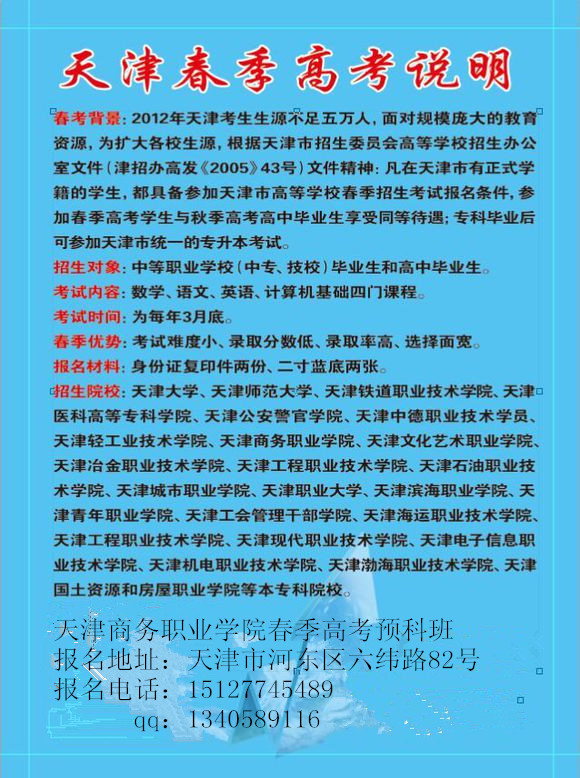 2016年天津春季高考预科班招生报名火爆进行中,欢迎应往届高中毕业生,中专、技校、职高毕业生报名咨询15127745489,qq1340589116