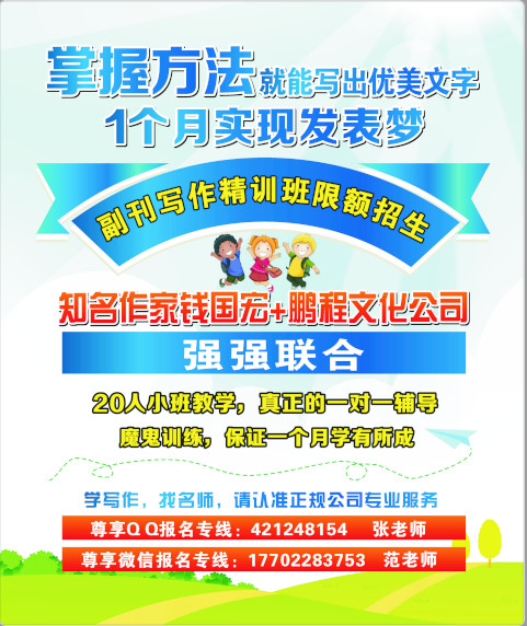招生流程:文友咨询——告知培训班详细情况——确定在20名以内——交费入群——开始学习——按时听课上交作业——作业点评修改——推荐投稿——优秀学员评选。