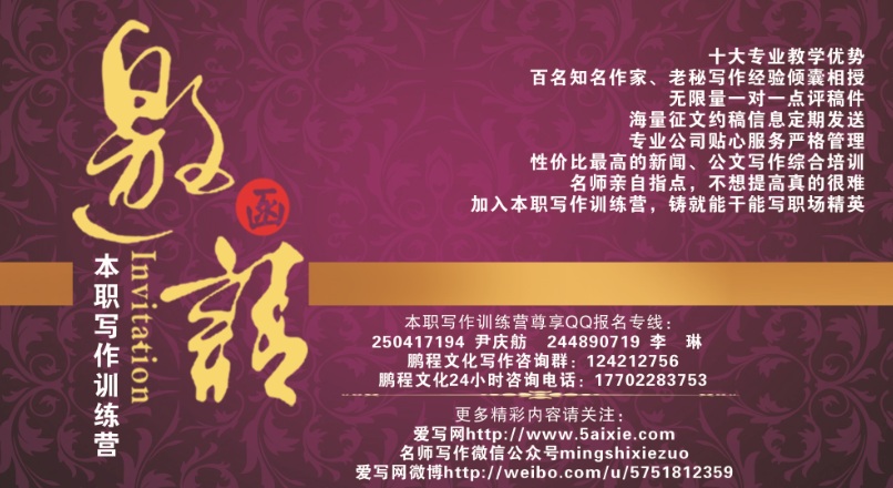 本职写作训练营是天津鹏程文化传播有限公司精心打造的涉及单位范围内的多文体、全方位的写作服务平台,知名作家、写手、老秘、笔杆子亲自授课,专业点评师细心点评稿件,优秀作品导读和写作知识分享并重,征文约稿信息定期发送,为你提供一对一、专业全面的写作指导服务,是你提高写作水平、实现职业梦想的至臻首选!