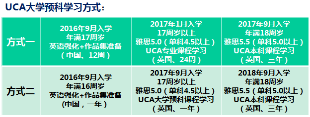 顺利完成并通过UCA艺术与设计国际大学预科课程的学生,保证直升UCA大学本科课程。UCA主要大学专业包括:动画、建筑与室内设计、手工艺、时装与纺织品、电影、美术、平面设计与插画、新闻、市场营销、管理与推广、媒体与数码、摄影和三维与媒体设计等