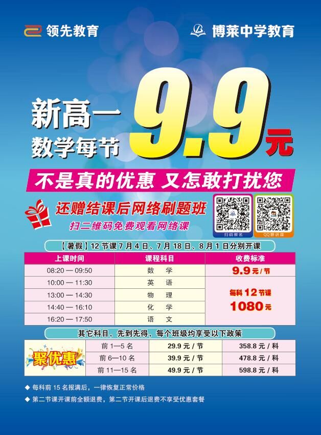我们的新高一的暑期数学特价班是9.9元/节,是原价90元/节的课程,一共是12课时,不是体验课,还包括讲义费,课后录播课程。